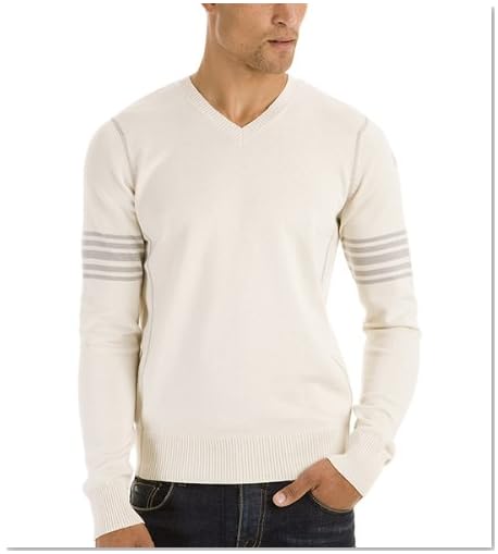 Show off your softer side with this plush v-neck pullover. Elegant striped arm banding Understated textured crest High contrast stitching Ribbed neck line and cuffs Men > Tops > Hoodies & Sweaters